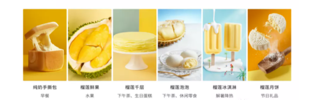 比如,早餐类的产品有榴莲纯奶手撕包,水果类产品有泰国金枕头榴莲鲜果,下午茶类的有榴莲千层蛋糕、榴莲泡泡甜点、榴莲饼等,夏季限定榴莲冰淇淋雪糕,节日礼品则有流量冰皮月饼、榴莲青团泡泡等。
