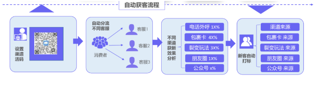 在整个自动化引流获客流程中,该客户全称使用壁垒SCRM为运营工具,在线上线下流量入口插入壁垒渠道码,商家将多个客服二维码聚合在渠道码内,终端用户扫码后根据不同来源渠道自动分流至相应的客服同时自动打标,保证所有引流数据均可追溯来源,提升用户体验的同时提升了工作效率。