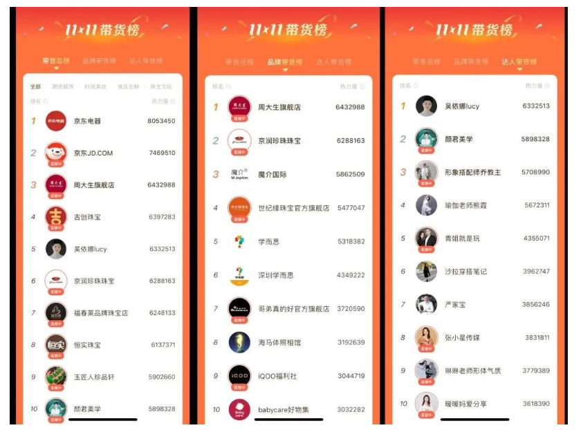 其中,周大生旗舰店仅次于京东电器、京东JD.COM,位列带货总榜第三,品牌带货榜第一。从相关博主公开的友望数据直播记录中看,可以看到周大生旗舰店在11月10日、11日这两天的场观人数均超过了40万,点赞次数也都超过30万。