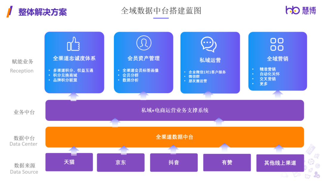 通过”慧博云千载数据中台“,该品牌将在天猫、京东、抖音、有赞、线下门店等多渠道会员数据、订单数据、商品数据等进行统一会员、数据清洗、模型构建,并与品牌自有CDP系统互通,实现双中台并行运营。