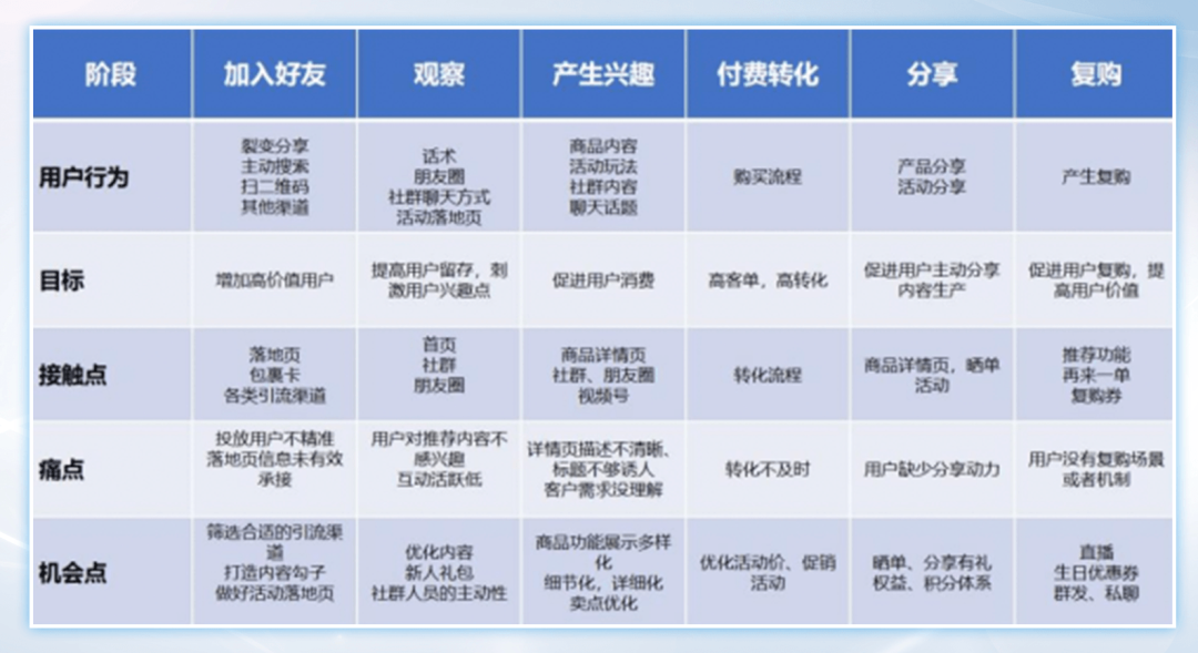 简单一点就是整个运营过程中我们核心的方法,是把用户从加入好友-观察-产生兴趣-付费转化-分享-复购 分成6个阶段,做成了一个用户行为旅程模型,并在这个模型中持续迭代优化。