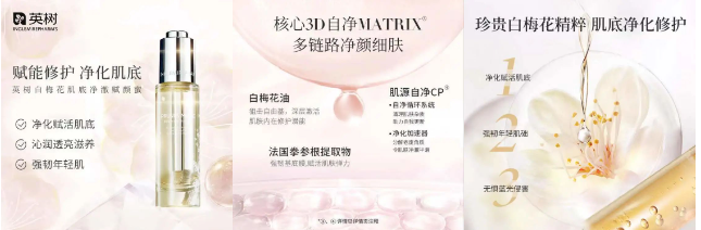 如英树旗下的白梅花系列,则是基于白博士团队研究数年的专利:低温双破壁专利加微囊化技术,通过高新技术提取白梅花中的精华成分,帮助肌肤排浊解毒,以科学的方式方法贯彻落实英树所提出的“精准高效”的护肤理念。