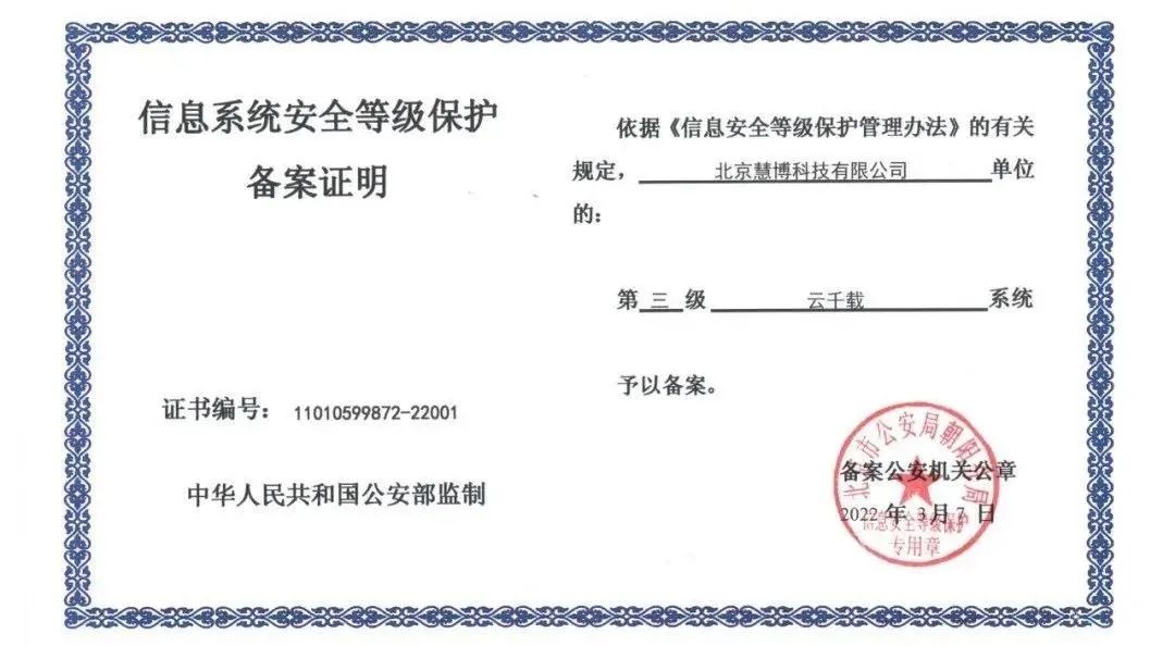 比如,已获得了【国家信息系统安全等级保护三级备案认证】,该认证由公安部核准颁发,为非银行机构参与测评的最高等级认证,这充分证明了慧博科技在用户数据信息系统安全保障已达到行业最高水平,并得到官方及专业机构的认可。