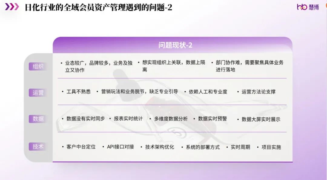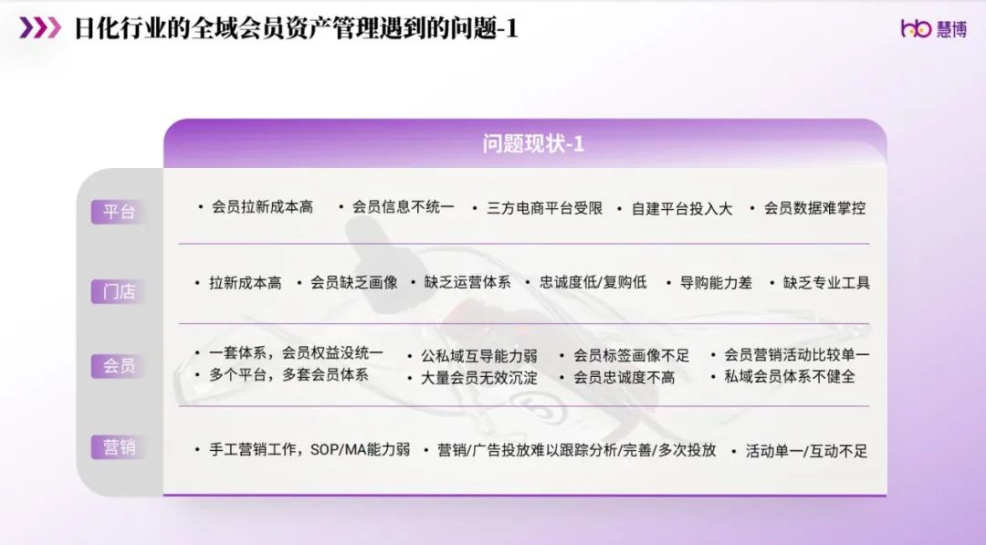 结合慧博科技多年来为国内外多家知名美妆品牌数字化转型升级服务的成功案例,及当前日化行业的趋势发展现状,发现日化行业当前的全域会员资产运营管理面临诸多问题,包含平台、门店、会员、营销、组织、运营、数据、技术等多个维度。