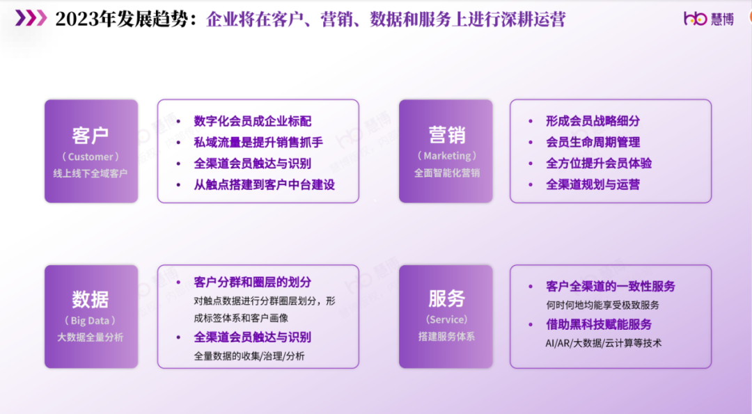 为帮助更多日化行业的企业在存量时代挖掘出会员资产的长效价值,为2023年积攒有效势能,慧博科技在此次分享中基于日化行业的会员业务运营场景为出发点,通过拆解会员管理的核心目标,提出了具体可执行的全域会员资产经运营策略。