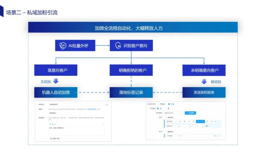 对于高意向客户,AI机器人会自动添加客户企业微信,快速沉淀新客;对于明确拒绝的客户,系统会自动进行用户行为标签记录,避免后续打扰,影响品牌印象;对于未明确意向的客户,则自动发送挂机短信,二次提醒客户自主添加企微,安全性更高。