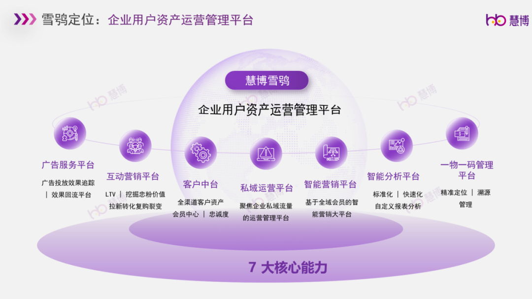 慧博【雪鸮】是慧博科技去年推出的全域消费者资产运营解决方案,以承接商家在广告服务平台、互动营销平台、客户中台、私域运营平台、智能营销平台、智能分析平台、一物一码等全链路的经营需求,帮助商家更好地洞察消费需求,精细化运营用户资产,实现品牌经营长效增长。