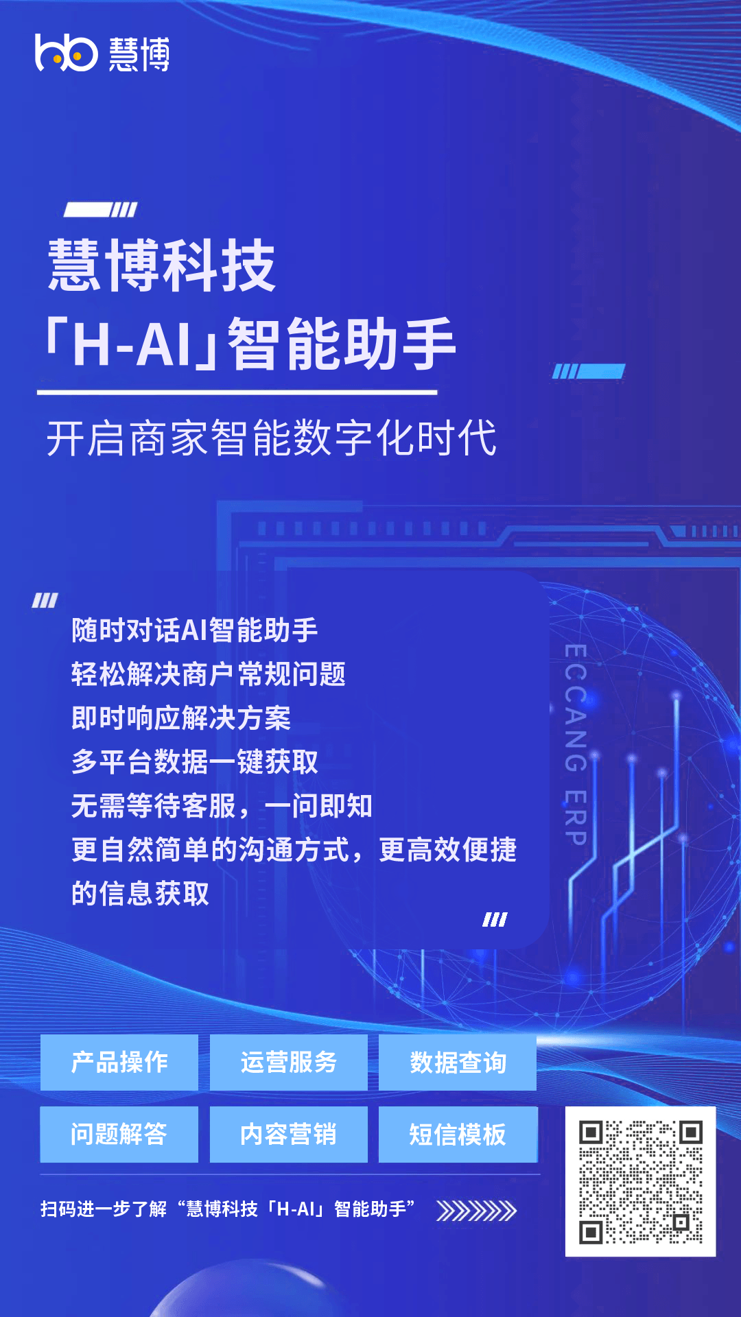 慧博科技「H-AI智能助手」有效解决了这一问题,不仅全面融入了慧博科技包括“零售、电商、营销、私域、客户管理”等业务在内深耕多年的知识库,深度覆盖商家在数字化运营全链路中的经营场景知识库,方便不同类目的商家能快速启用,更预置了商家需要关注的多个高频、热门咨询问答,商家只需在慧博任意产品后台找到「H-AI智能助手」点开即可投入使用,即问即答,轻松解决各种疑惑,大幅降低产品使用难度,商家运营效率快速提升。