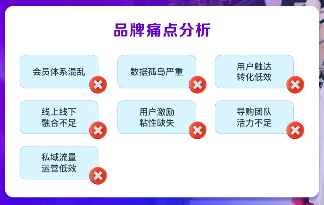 1、会员体系混乱:多品牌多个会员体系,无法统一运营管理,影响用户体验和品牌忠诚度。