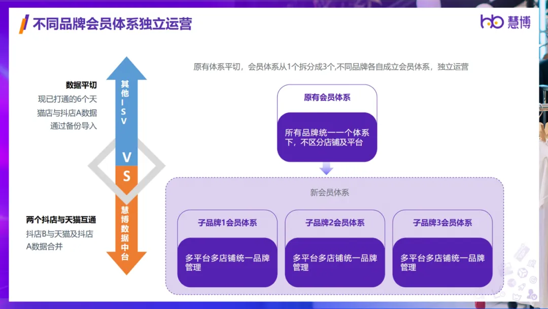 面对X服饰品牌品牌旗下多个子品牌和多平台店铺的运营需求,慧博科技巧妙地重塑了会员体系。通过平切原有会员体系为三个独立运营的体系,不仅满足了各品牌间的差异化需求,还通过数据中台技术实现了会员身份和权益等级的统一管理。该策略有效的确保了顾客在任何平台或店铺都能享受到一致的优质服务。
