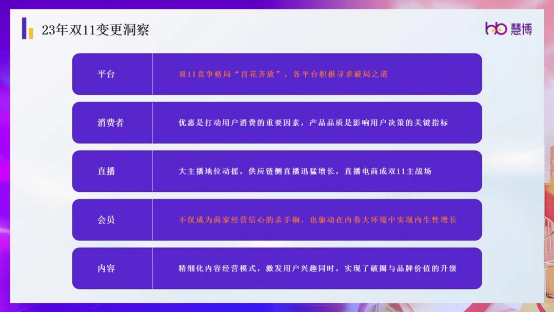 今年,慧博科技再次出发,基于最新的市场洞察及各大平台大促规则,为商家精心策划了一套全面且高效的“全域会员提效策略方案指南”。方案不仅贯穿双11大促的全周期,更从多维度、深层次为商家提供精准、高效的运营指导,确保商家在激烈的市场竞争中脱颖而出,实现双11销售业绩与会员数量的双重飞跃。