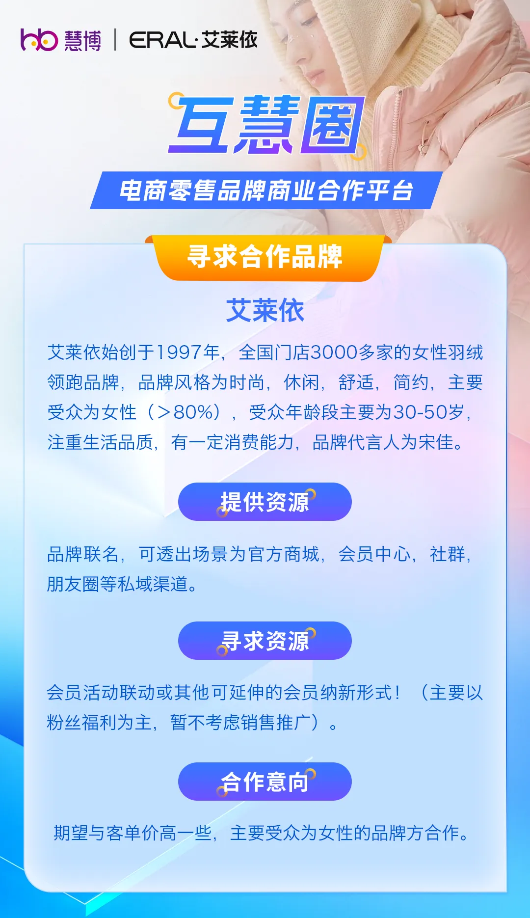慧博科技在电商零售领域深耕多年,积累了丰富的行业资源和深厚的客户信任。为了进一步优化服务体验,我们特别推出了 “互慧圈”—— 这是一个专为电商零售品牌打造的商业合作平台。它的创立,源于我们对客户需求的深刻洞察和对行业资源的精心整合。“互慧圈” 不仅承载着我们对客户服务体验的不懈追求,也体现了我们对促进行业内部合作、共同进步的承诺。