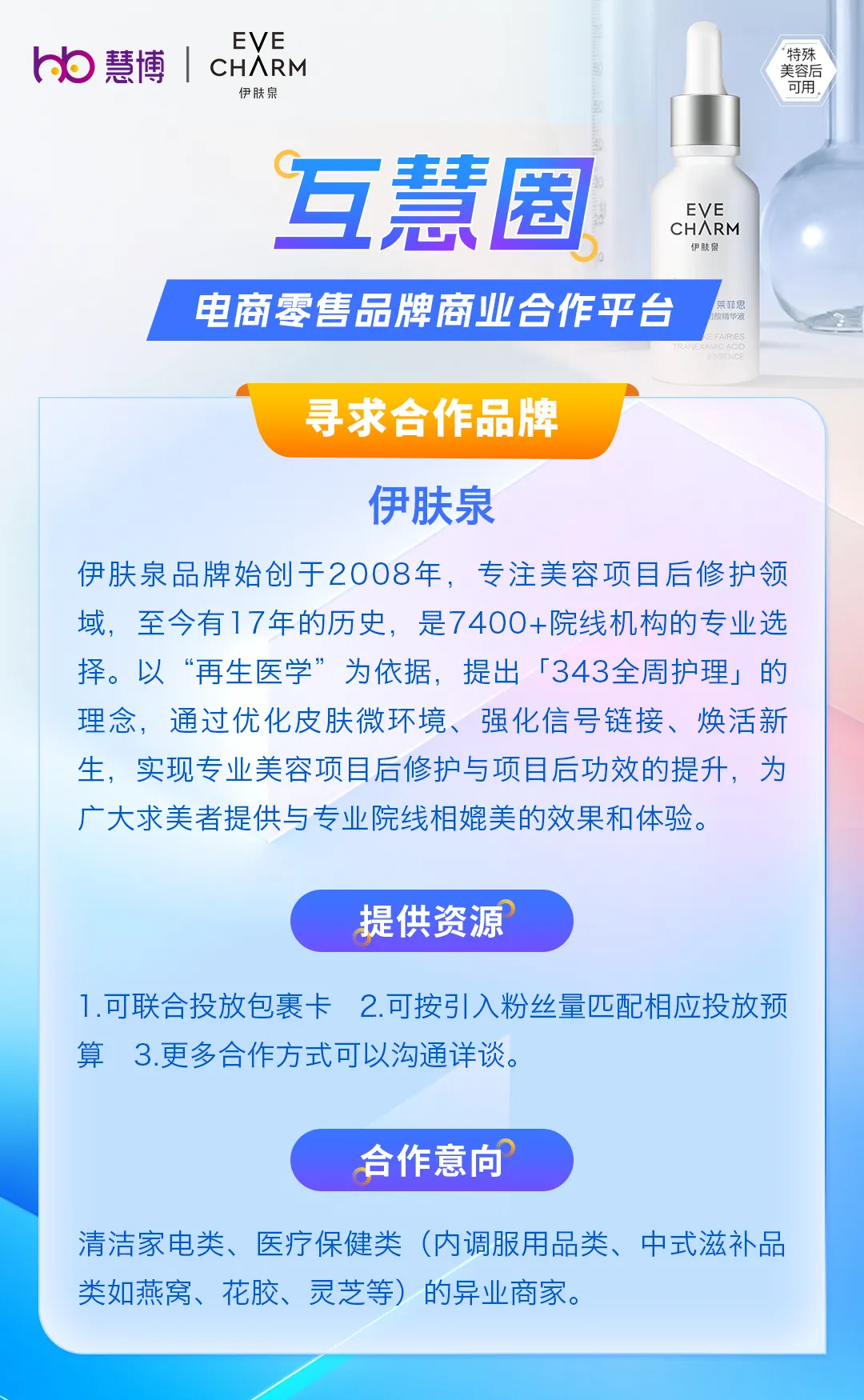 加入方式:联系您的所属客服,或在公众号后台留言,获取合作信息填写表单,经过合作内容及真实性审核后,我们将第一时间将合作信息发布于【北京慧博科技】公众号-右下角服务咨询-互慧圈菜单内,并为您匹配推荐合适的品牌商家。