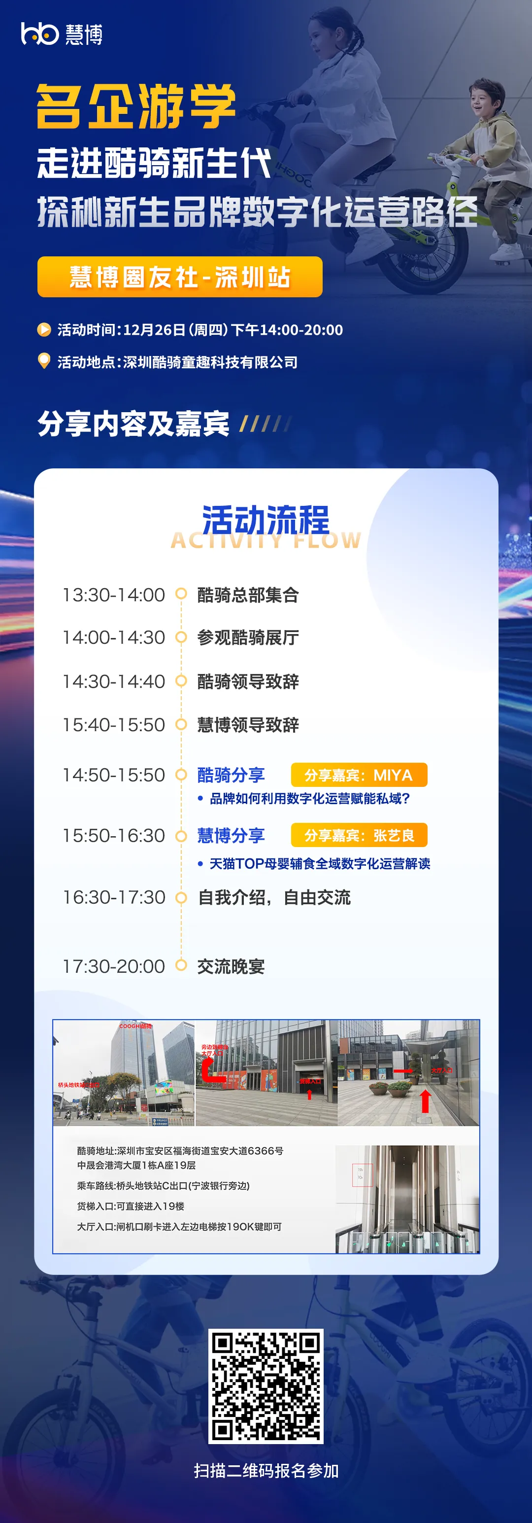 这不仅是一次难得的学习之旅,更是一个交流思想、碰撞智慧的绝佳平台,我们诚邀各企业高管、电商负责人共聚一堂,一起走进酷骑,探寻数字化运营的奥秘。