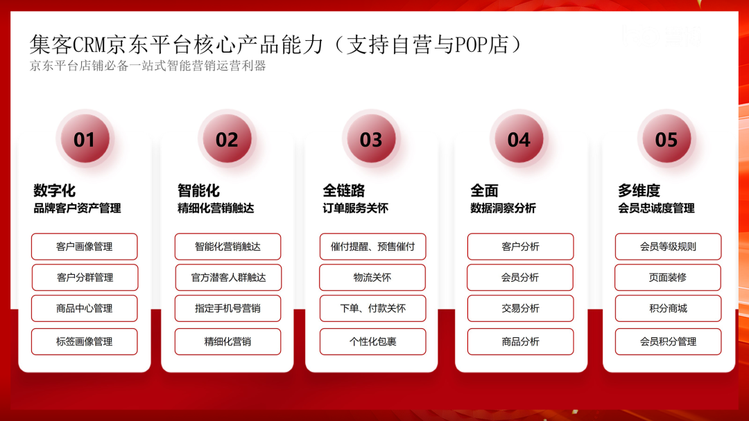 深耕京东生态十年,慧博科技基于「客户资产管理 × 精准营销 ×订单服务关怀 × 智能决策× 会员忠诚度管理」五位一体增长模型,为京东自营商家定制了全链路 CRM 解决方案 ——「集客 CRM - 京东版」。
