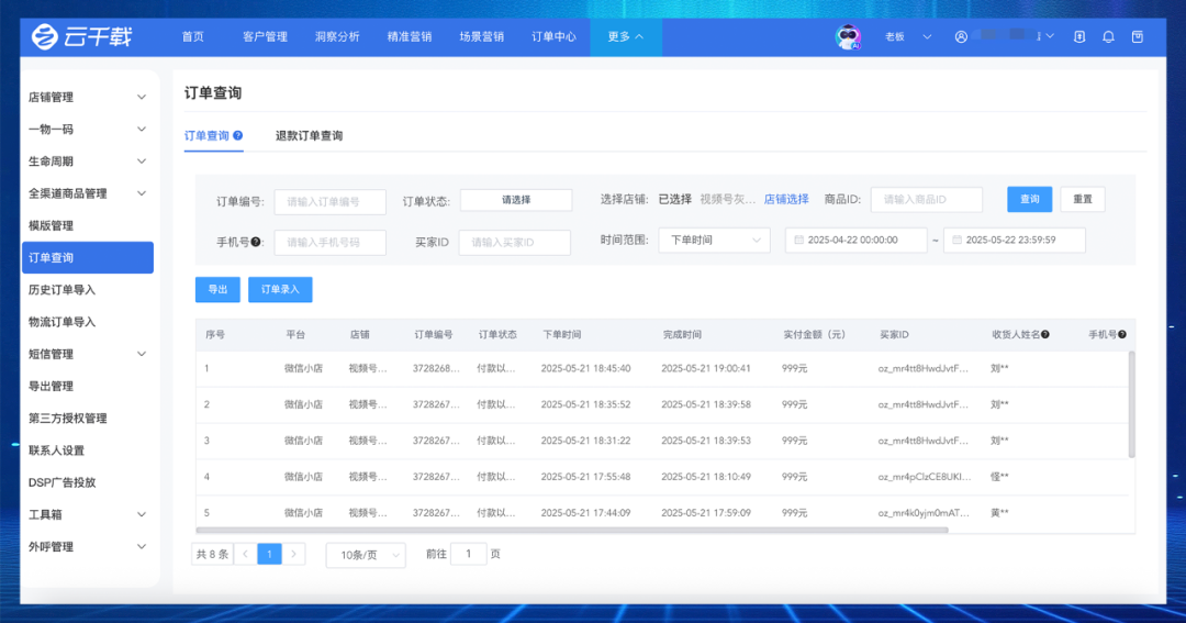 • 订单通:同步订单数据并自动匹配全渠道会员,让每笔交易成为会员资产积累的“燃料”;