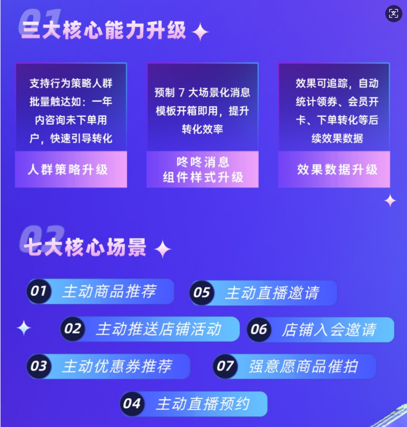• 京东咚咚 “营销类消息” 升级:新增“行为策略人群批量触达”“7 大场景模板开箱即用”“转化数据追踪” 三大核心功能,让大促期间的精准沟通效率明显提升;