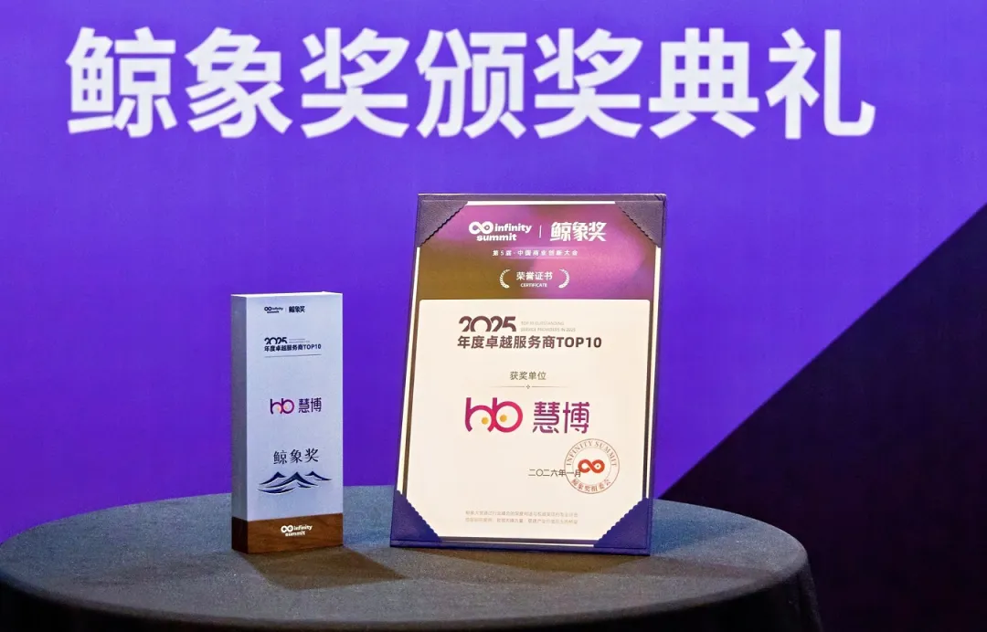 其中“年度十大卓越服务商” 荣誉,更是对企业商业数智化创新能力与服务价值的高度认可。慧博科技凭借在消费行业数智化领域的扎实创新实践与突出服务成果,历经严苛考评,成功跻身 “鲸象奖・2025年度十大卓越服务商” 行列。